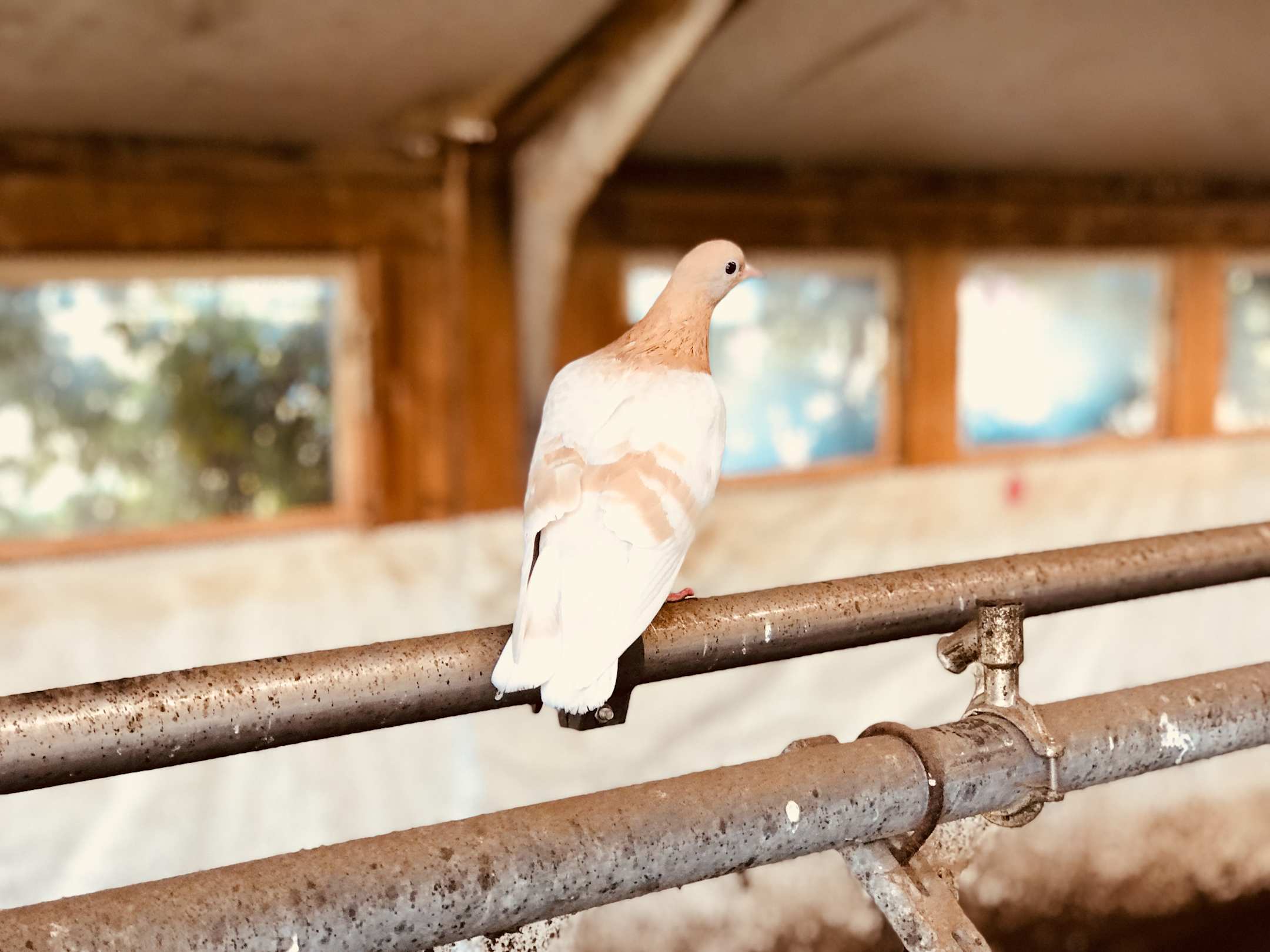 Arabische Trommeltaube im Farbenschlag gelbfahl. Impression im Kuhstall.