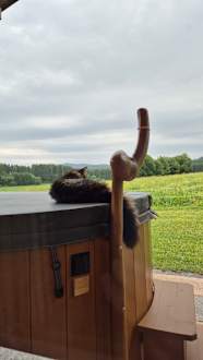 Katze auf dem warmen Hotpot bei Regen