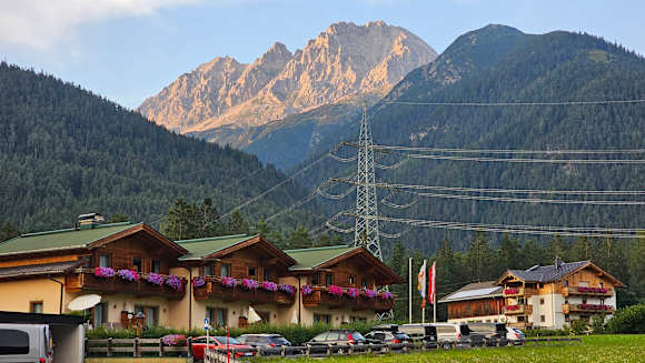 AußenansichtLinks sind die Chalets zu sehen, mit ihren wunderschönen Blumenkästen in einem tollen Bergpanorama