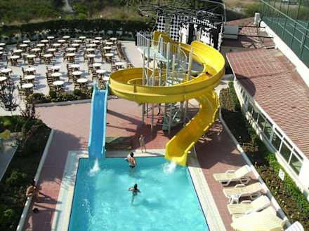 Blick auf Wasserrutsche und Bühne