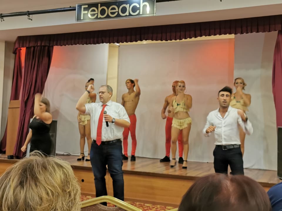Das innensaal für Veranstaltungen der u ter anderem wie an diesem Tag bei Regen genutzt wird auf der Bühne eine Gruppe Akrobaten und im Vordergrund der namensgeber des hotels Sven und Alena und Oscar beim Clubtanz