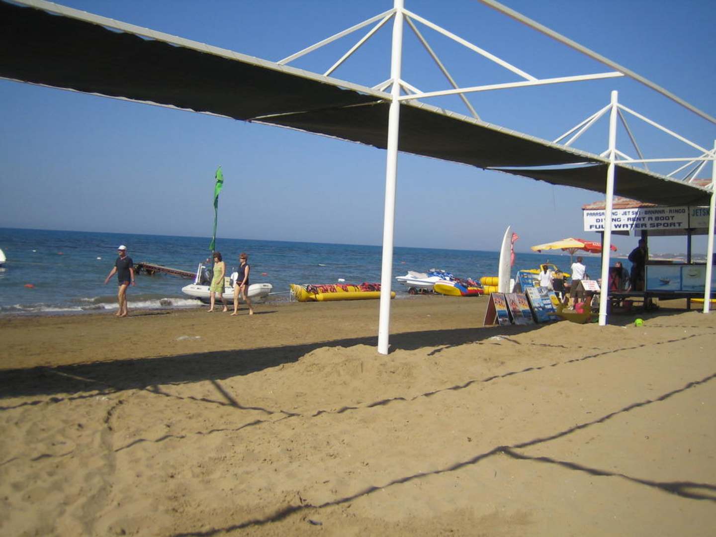 Am Strand warten schon diverse Wassersportgeräte auf ihren Einsatz