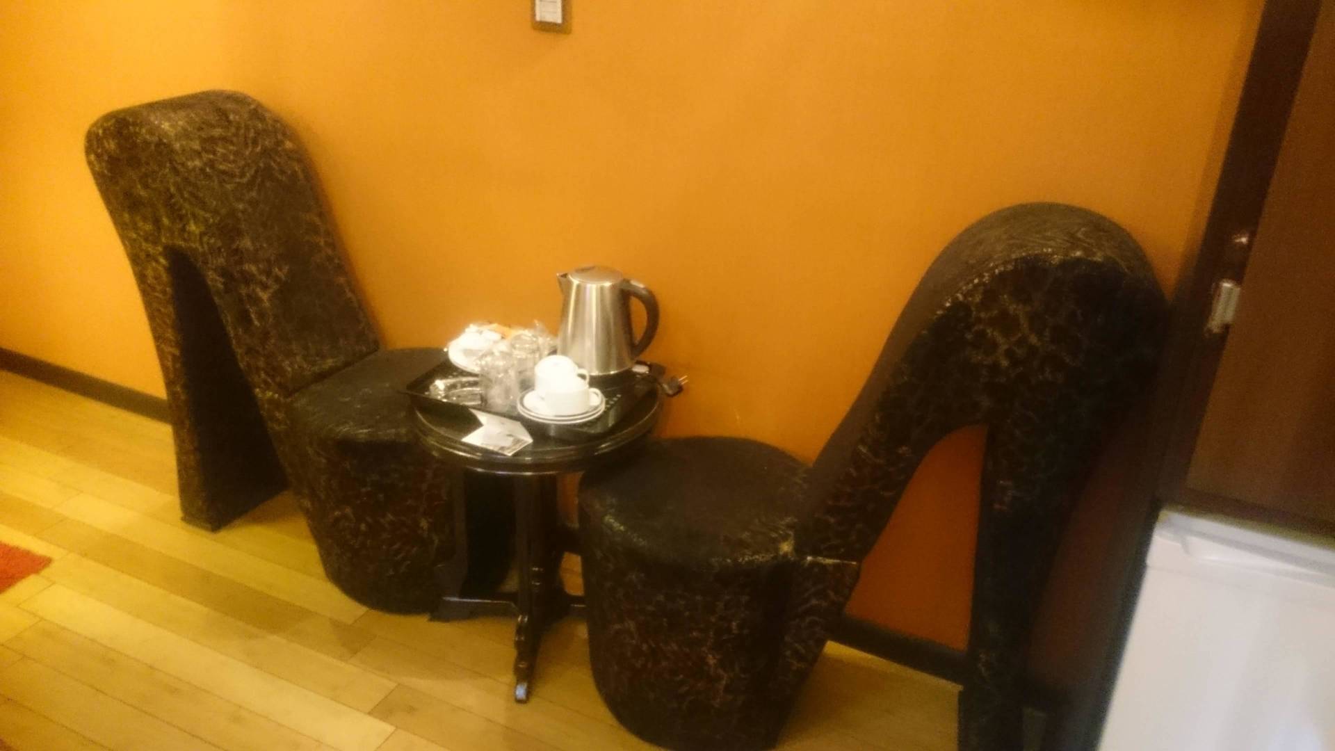 Sitting corner with tea kettle, cups and pastry