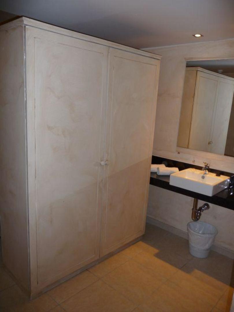 Der Waschtisch ausserhalb des Badezimmers, der Schrank dient als Raumteiler zum Schlafbereicht