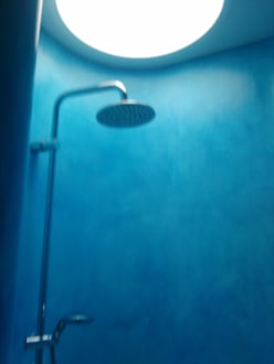 riesige Schneckendusche - Regendusche mit Handbrause - und Fenster Richtung Himmel