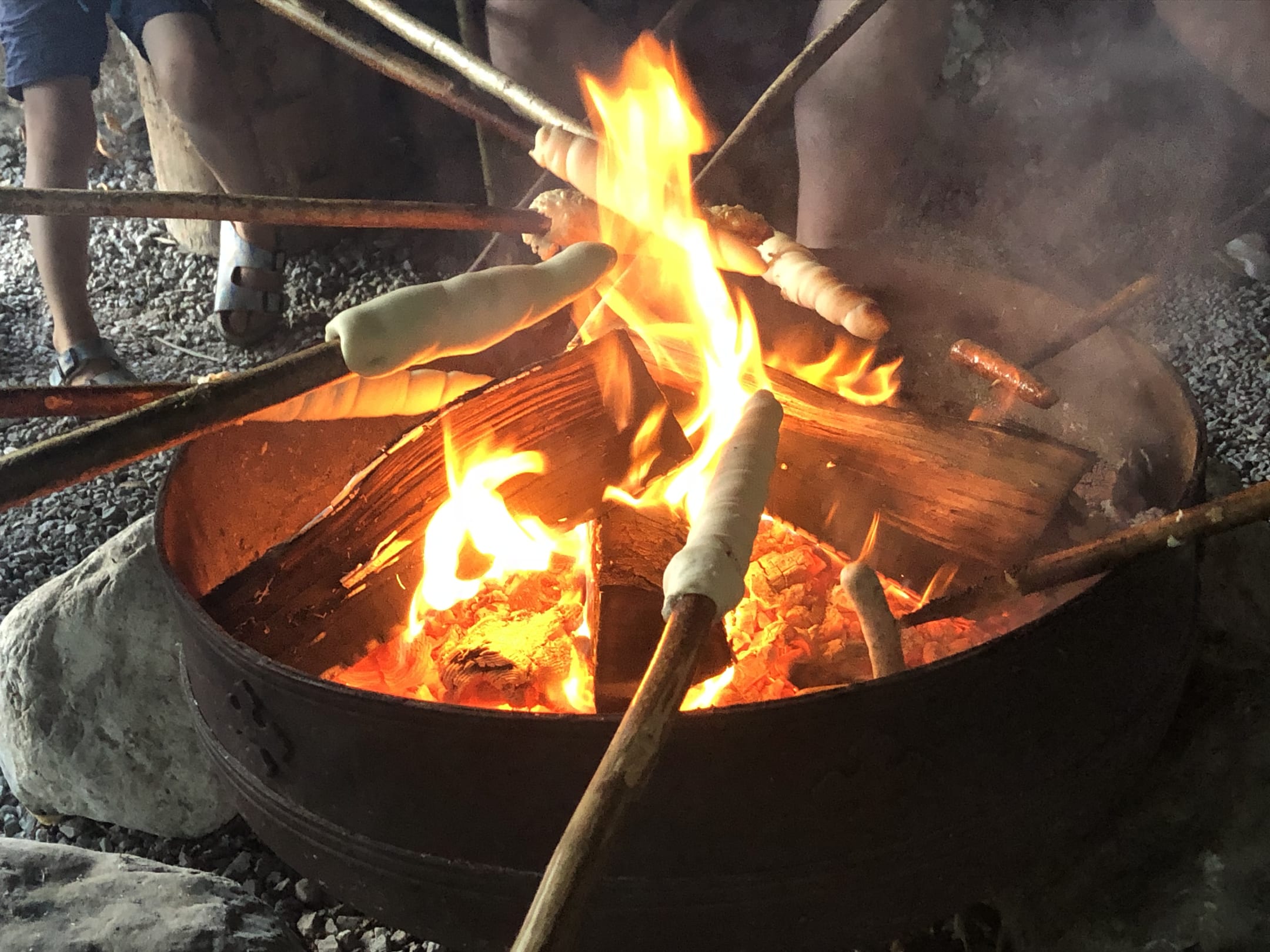 Lagerfeuer mit Stockbrot und Grillwürste