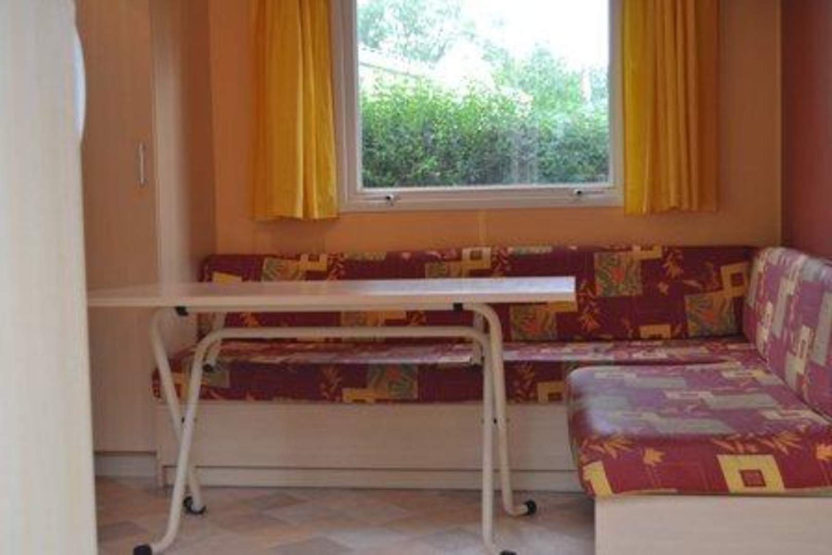 Gemütliche Sitzecke. Links neben der Ecke befindet sich ein kleiner Schrank mit Besen und dem Warmwasserboiler. Ein eingelegtes Brett bietet zusätzlichen Stauraum.