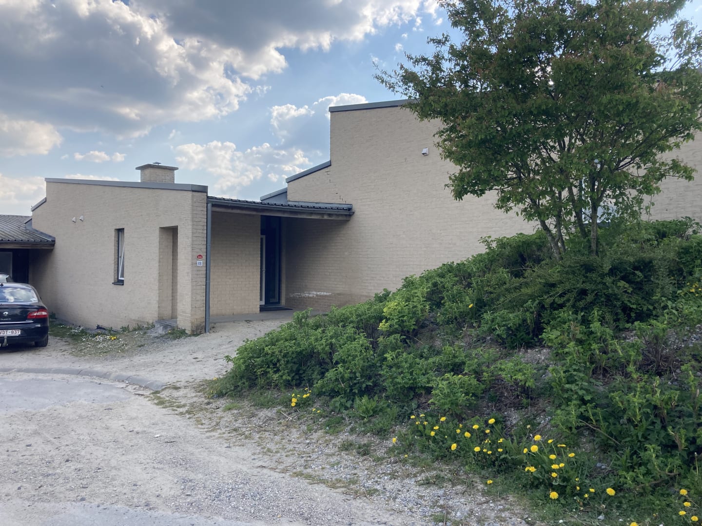 Aussenansicht mit Eingang und Einstellplatz.