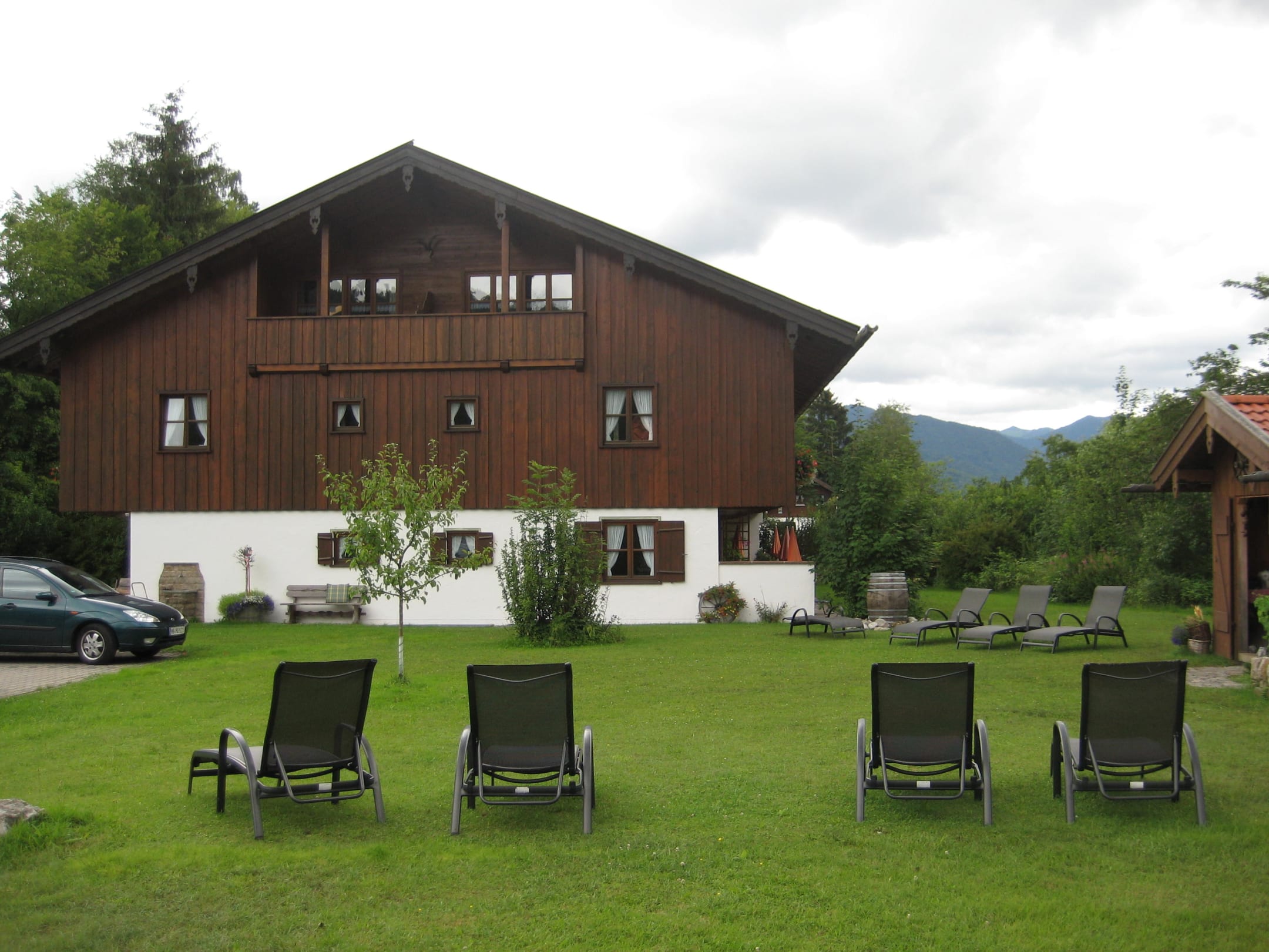 Rückseite des Hauses mit Parkplatz und Garten