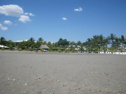 Zwei Fotos (hier in Richtung Hotel) zeigen, wie weit der Strand entfernt ist. Barfuss kann man ihn bei Sonnenschein nicht erreichen.