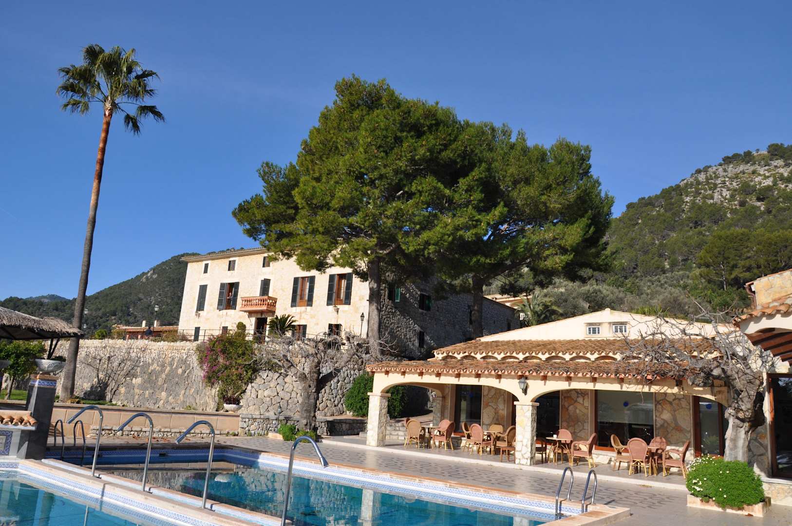 Blick vom Pool auf das Herrenhaus