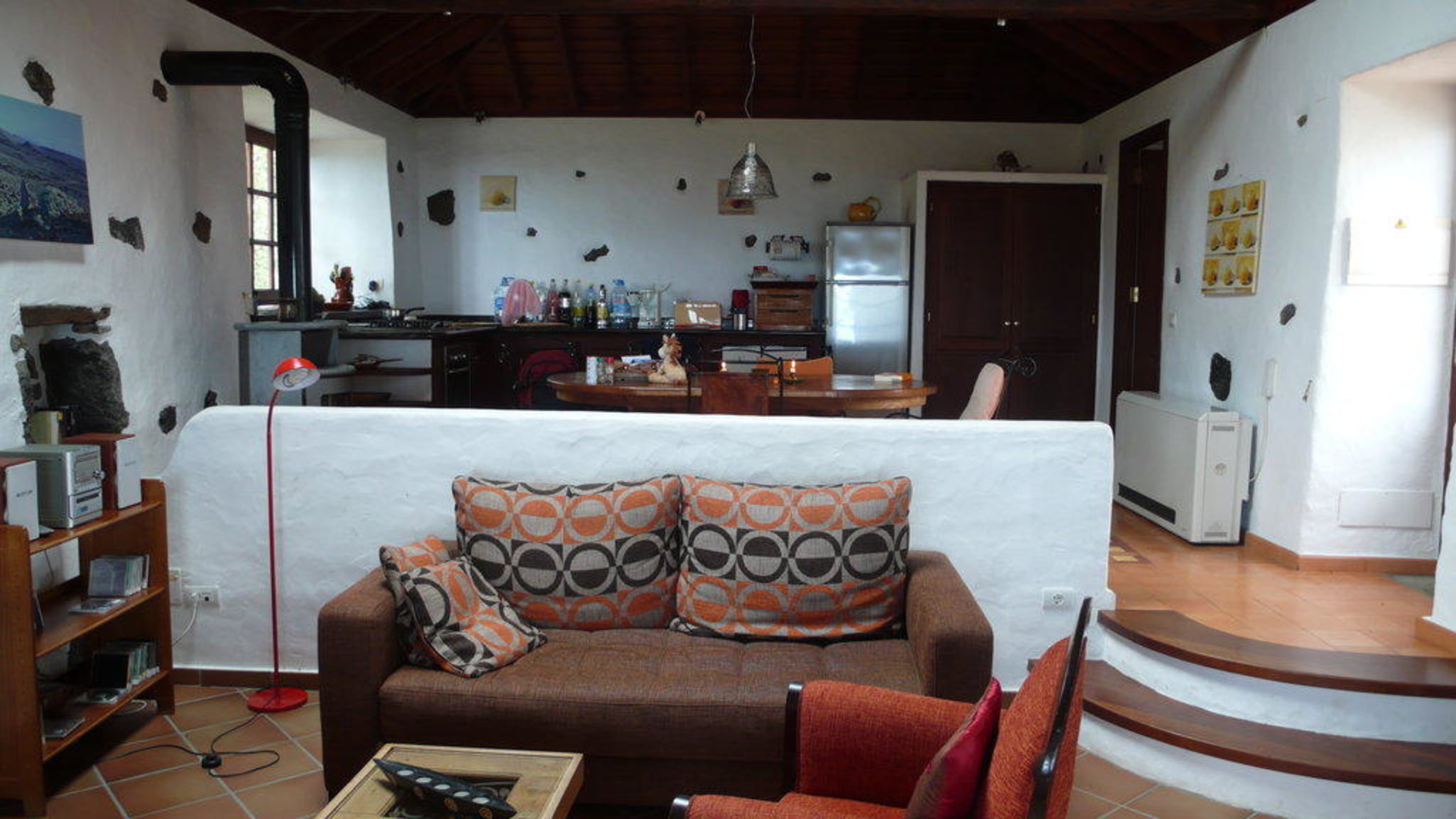 ein Blick von der Terrassentür in das gemütliche Wohnzimmer. Wie man erkennen kann, liegt der Wohnbereich 2 Stufen unter der Küche. Einfach wunderschön die Lösung mit der halbrunden Treppe. Sehr geschmackvoll!!!