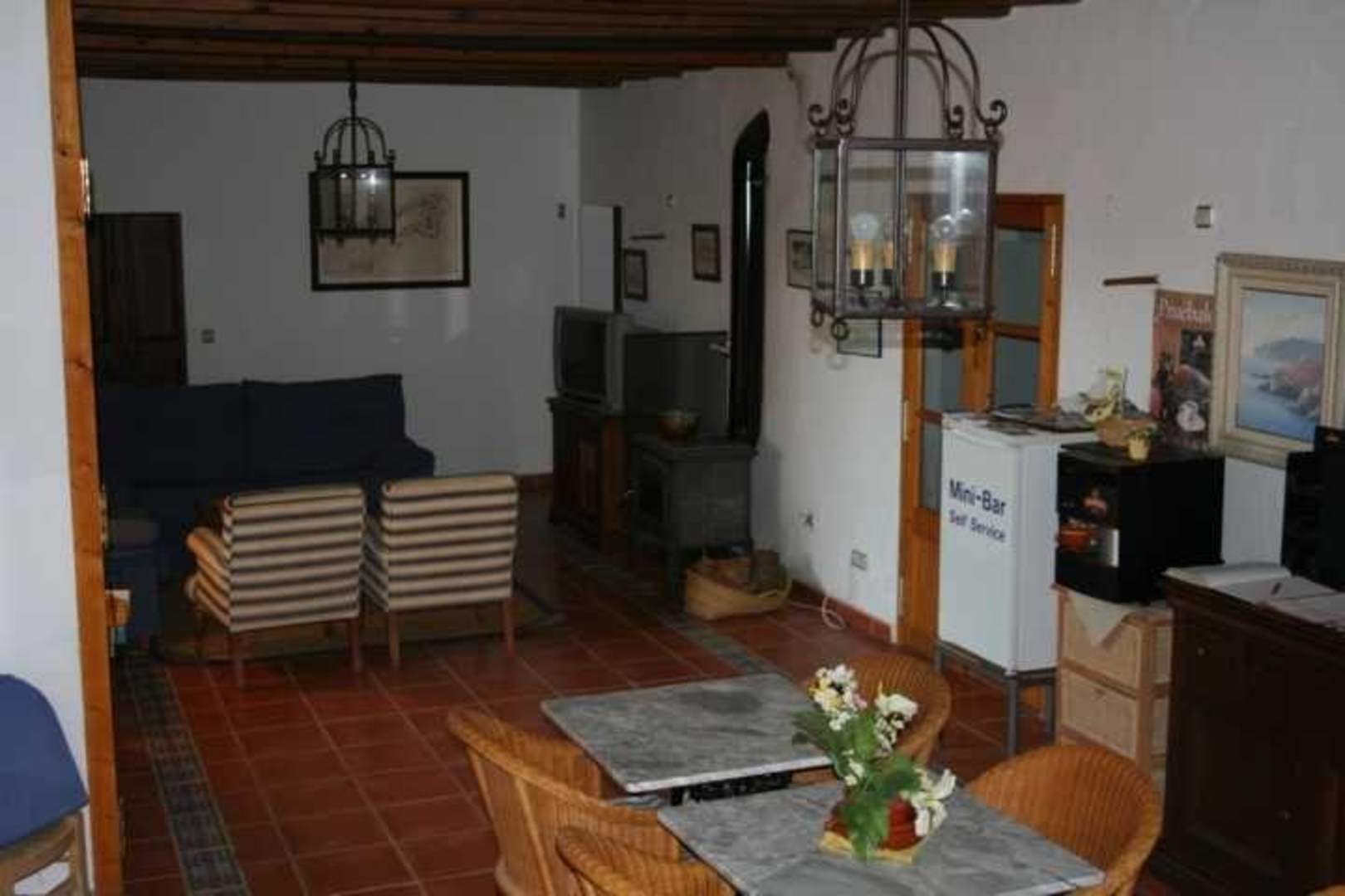 Der untere Salon ist der Speiseraum. Drei Zimmer haben von hier ihren Zugang. Hier steht der Kühlschrank und die Kaffemaschine für die Gäste.