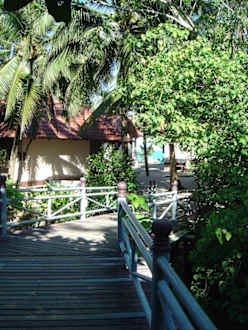 ...von den Zimmern/ Pool über die Brücke der Lagune zum Strand und den Beach-Bungalows.