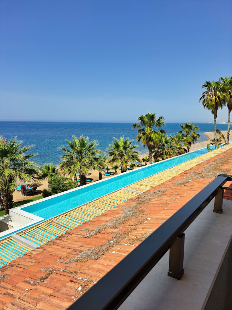 Blick vom Balkon zu den unteren Zimmern und zum Strand