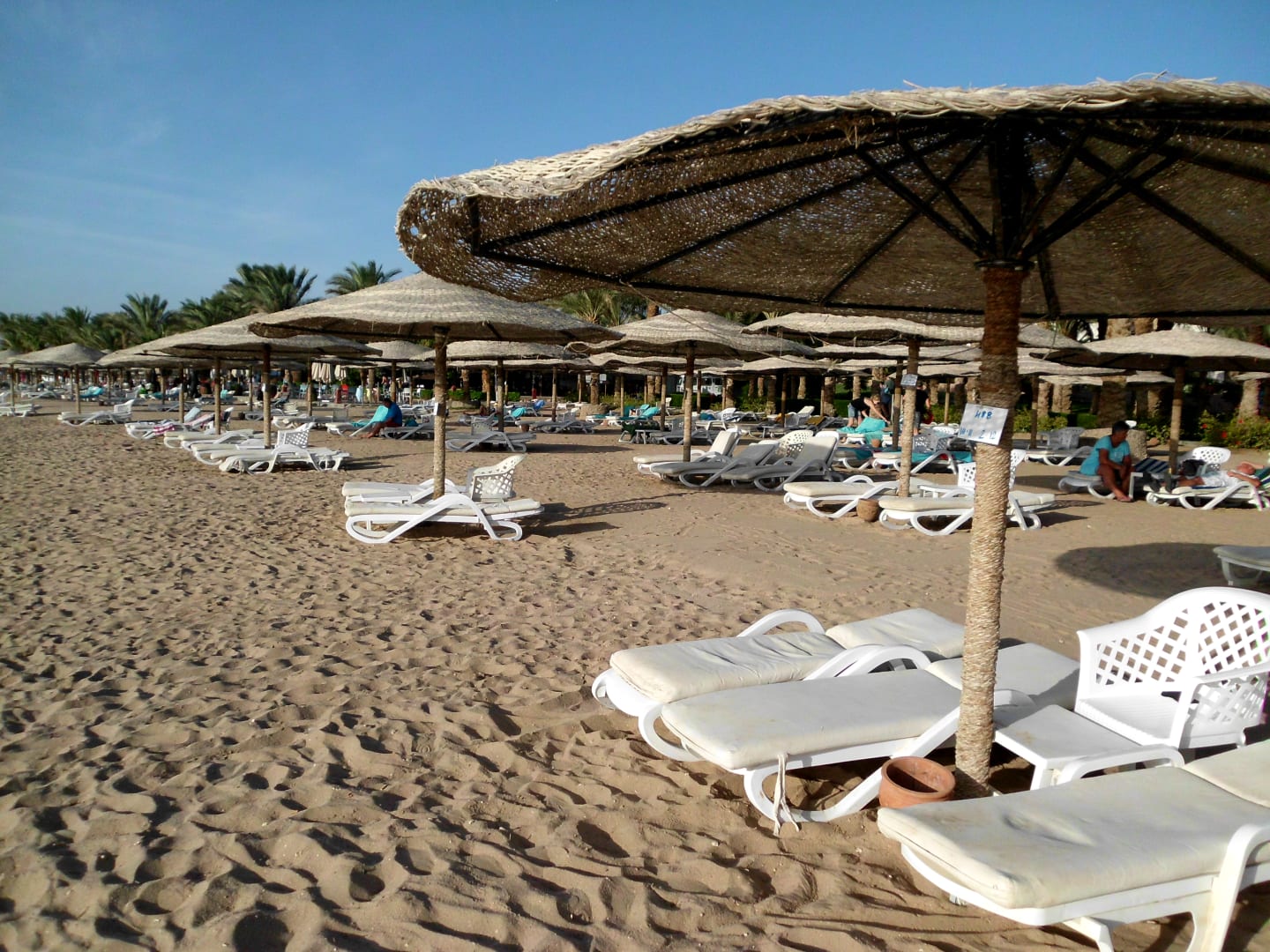 Viel Platz zwischen den Liegen. Weiße Vermietungsschildchen an den Schirmen