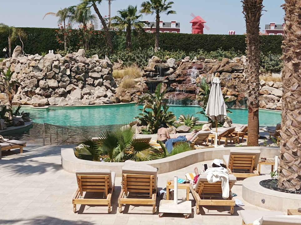 Poollandschaft mit Wasserfall, dahinter "Moulin Rouge"