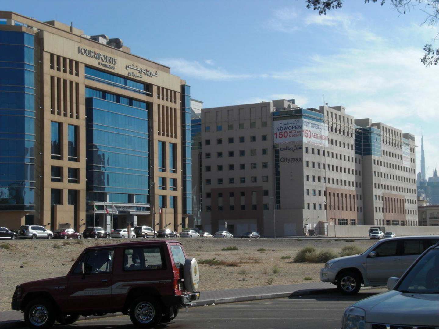 zu sehen ist links das Four Points Sheraton Hotel Dubai Downtown. Vor dem Hotel befindet sich eine Freifläche, hinten und seitlich stehen gleich hohe Häuser (links Standard Chartered Bank und rechts ein anderes Hotel).