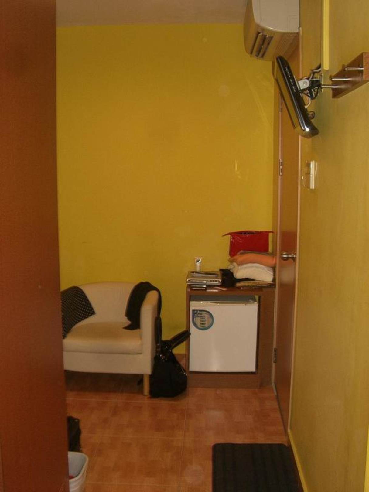 Blick auf eine winzige Sitzecke mit 2 Sesselchen und einem Kühlschrank.