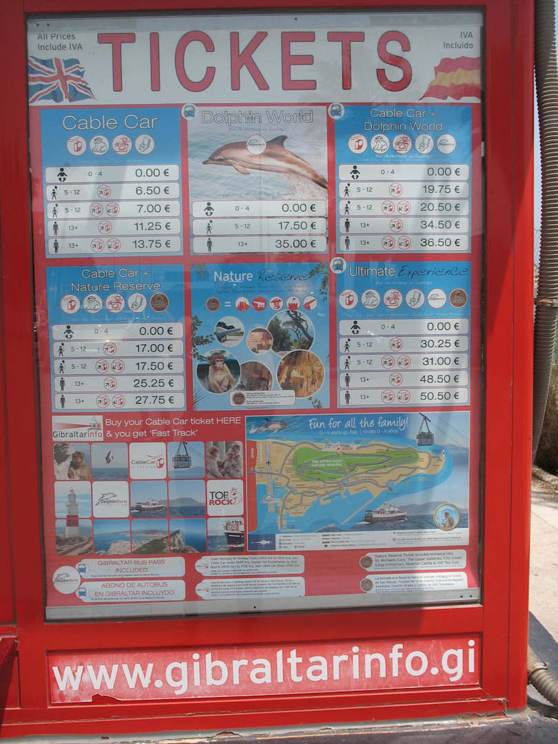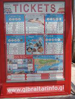 Preistafel für die Unternehmungen auf Gibraltar.