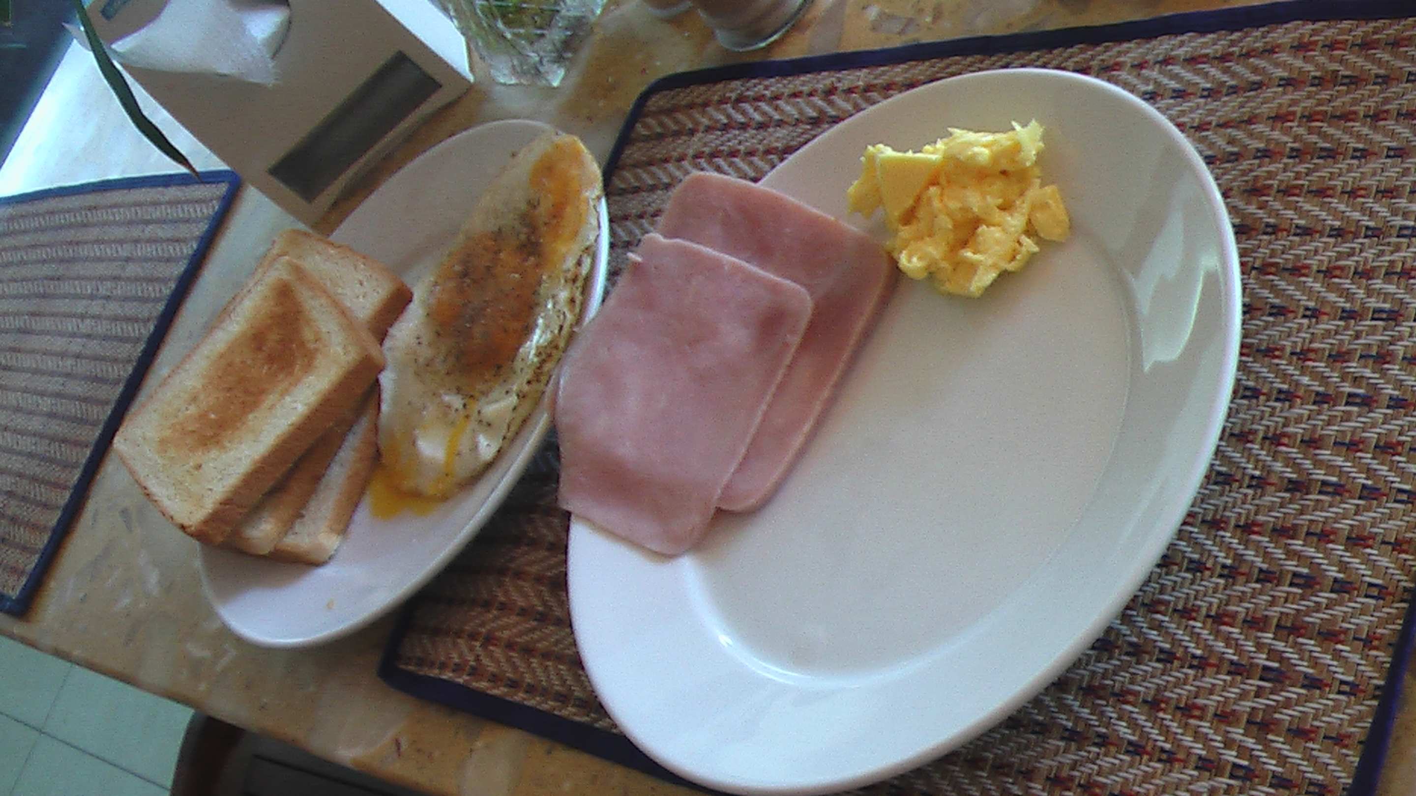 Frühstück - 3 Toastbrote + Spiegeleier + Formschinken + Butter ( offen )