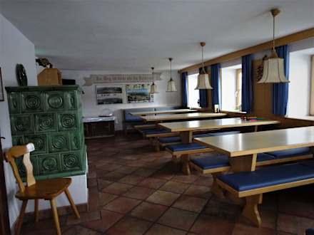 Der Speiseraum im alten GebäudeteilIm neuen Gebäudeteil gibt es im Speiseraum gepolsterte Stühle mit Lehne.