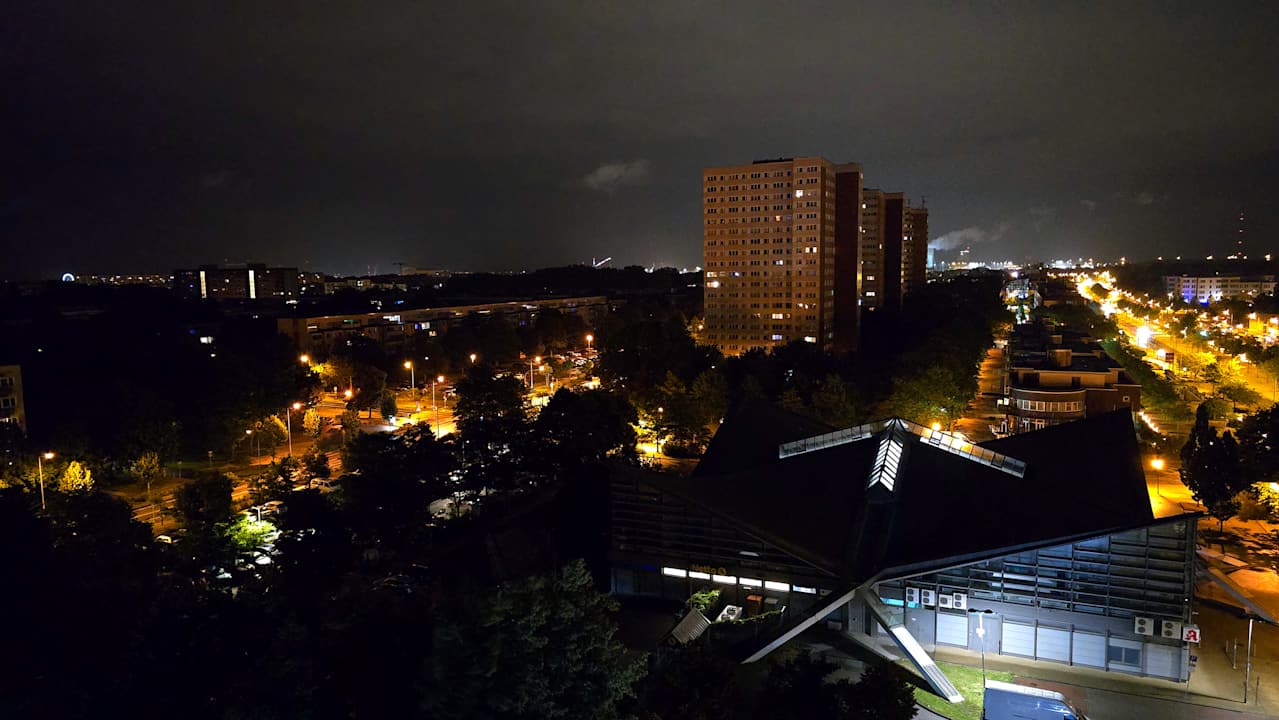 Zimmer 1004 - Ausblick in der Nacht. Links im Bild sieht kann man das Riesenrad von Warnemünde sehen.
