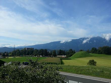 Blick vom Balkon auf die Berge und Burg Sommeregg