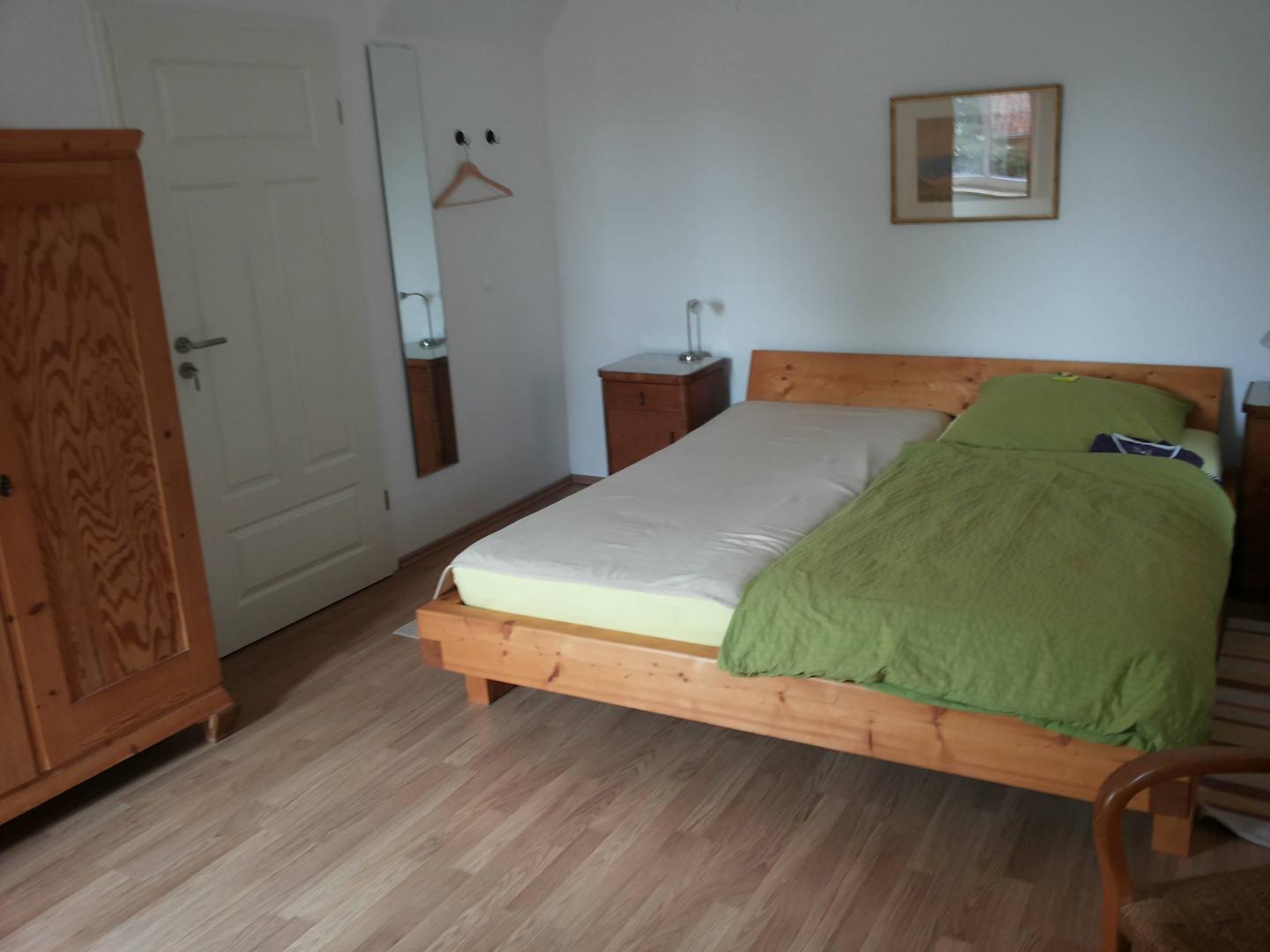 Bett, Spiegel, Eingang und Schrank
