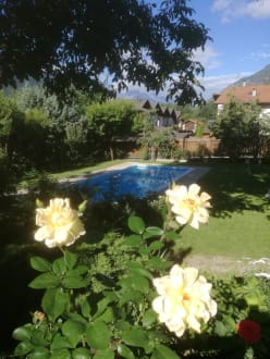 Blick von der Tisch- und Bankgarnitur am Grill, über Blumen zum Pool