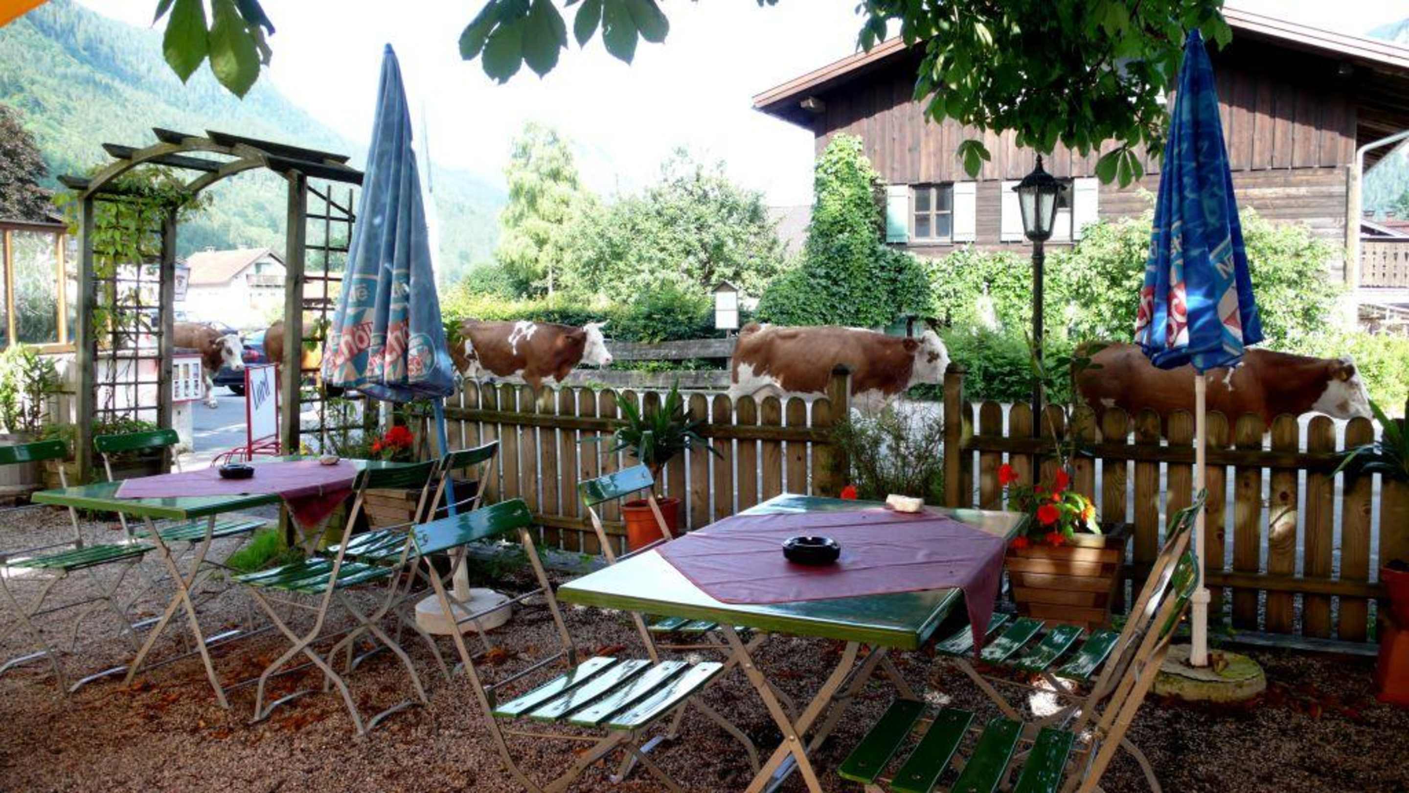 Der Biergarten des Gasthauses Zum FischerwirtDas allabendliche Ritual im Sommer: die Kühe kommen zum Melken in der Stall.