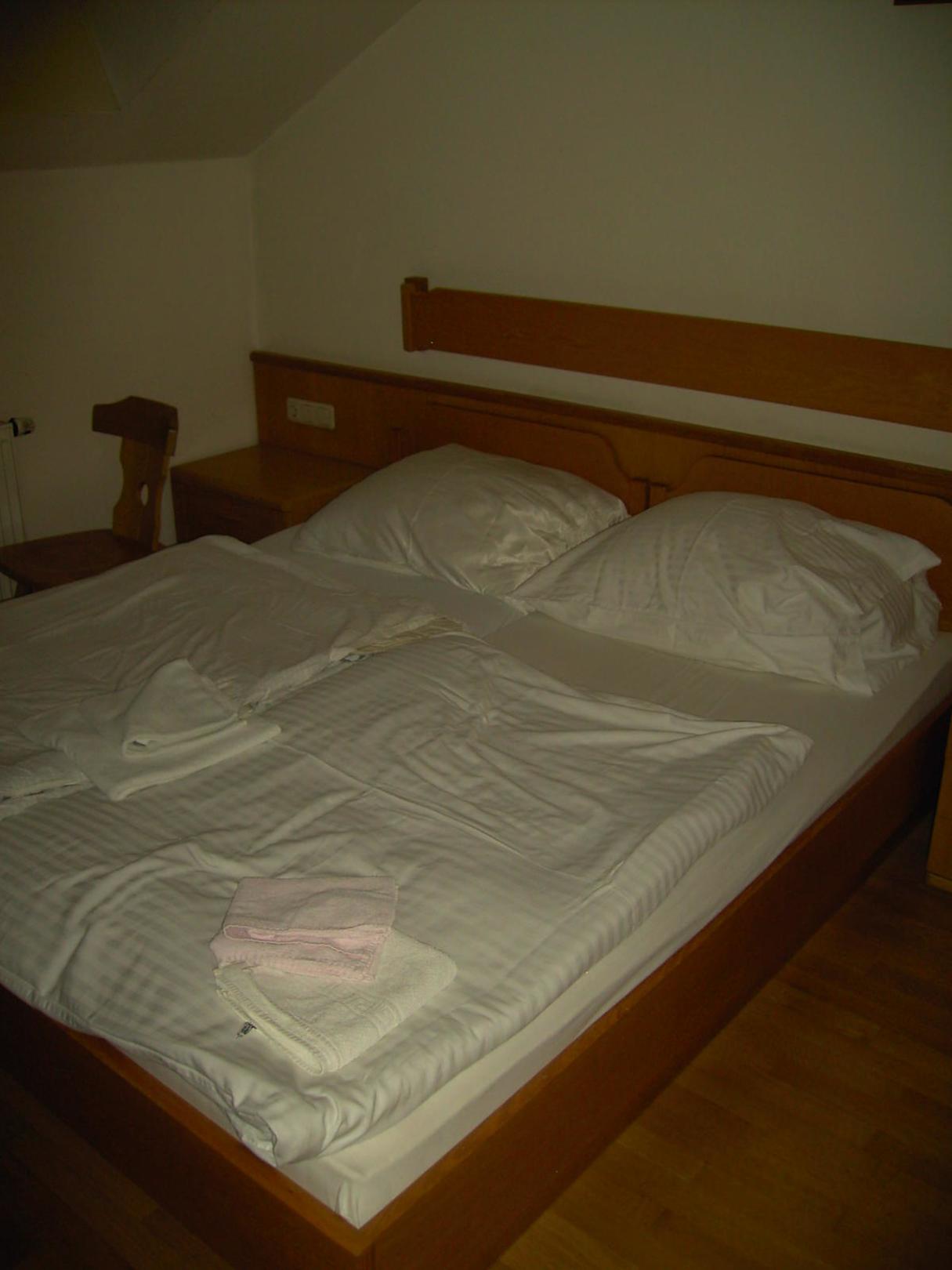 Betten sehen aus wie benutzt beim Betreten des Zimmers.