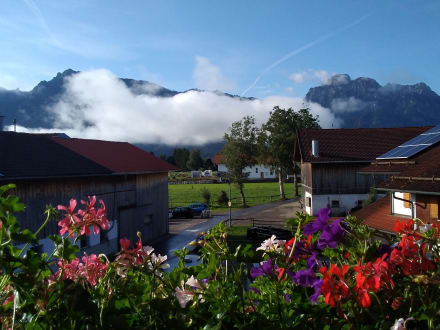 AusblickFoto von einem Balkon der Seeklause. Vor uns links der Tegelberg rechts der Säuling. Davor eine weiße Zauberwolke.