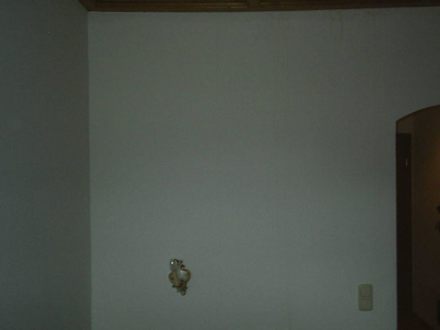 Schlafraum mit riesigen Wasserfleck auf der WandHier ist der Schlafraum abgebildet, man sieht braune Wasserflecken von der Decke zum Boden verlaufen. Mal ganz abgesehen von der kargen Einrichtung und der schief angebrachten Lampe. Naja........
