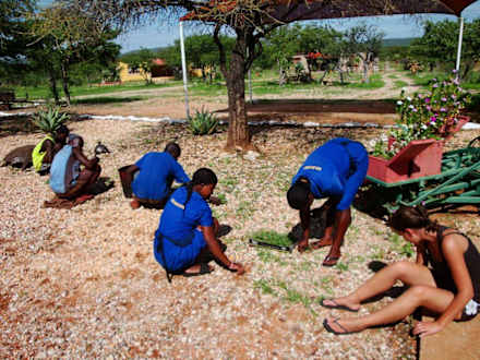 fleissige, singende mitabeiter der lodge bei der verschönerung der anlage