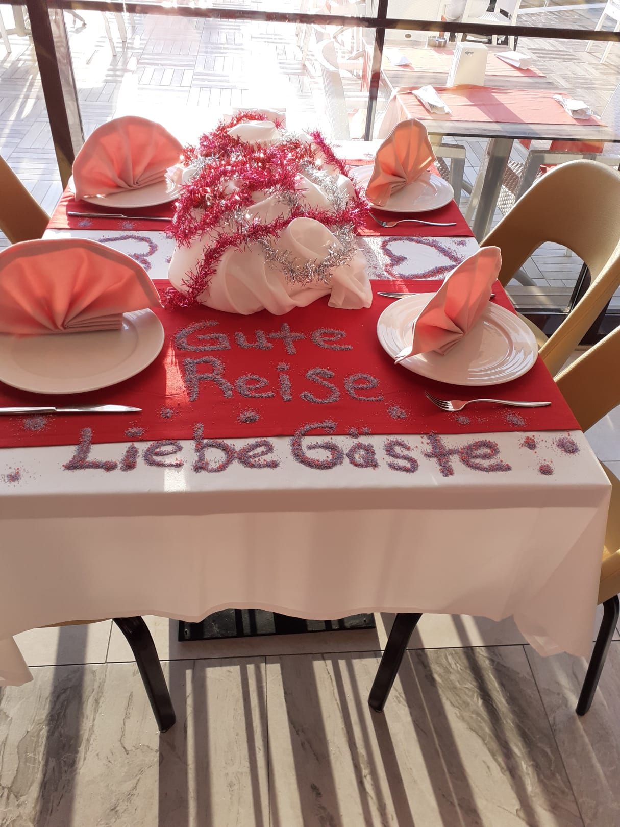Dieser schöne Tisch wurde und am letzten Abend hergerichtet von einem netten Kellner.Vielen Dank auf diesem Weg an Mehmet sowie an die Gästebetreuerin Seyhan.