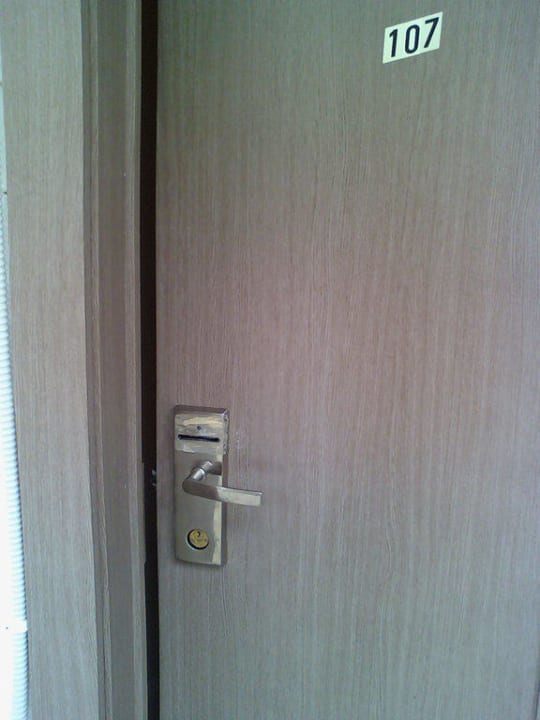 Zimmertür / Herzlich WillkommenSchon an der billigen Nummerirung erkennt man die Qualität. Billig Billig Billig. Am Türgriff war einmal etwas mit klebeband befestigt. Die Reste des Klebebandes kleben noch immer am Griff und werden sicher auch noch lange kleben. Ekel !