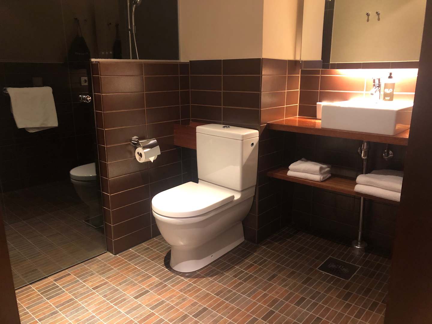 Blick ins Bad. Hinter der Glastüre befindet sich die Dusche.