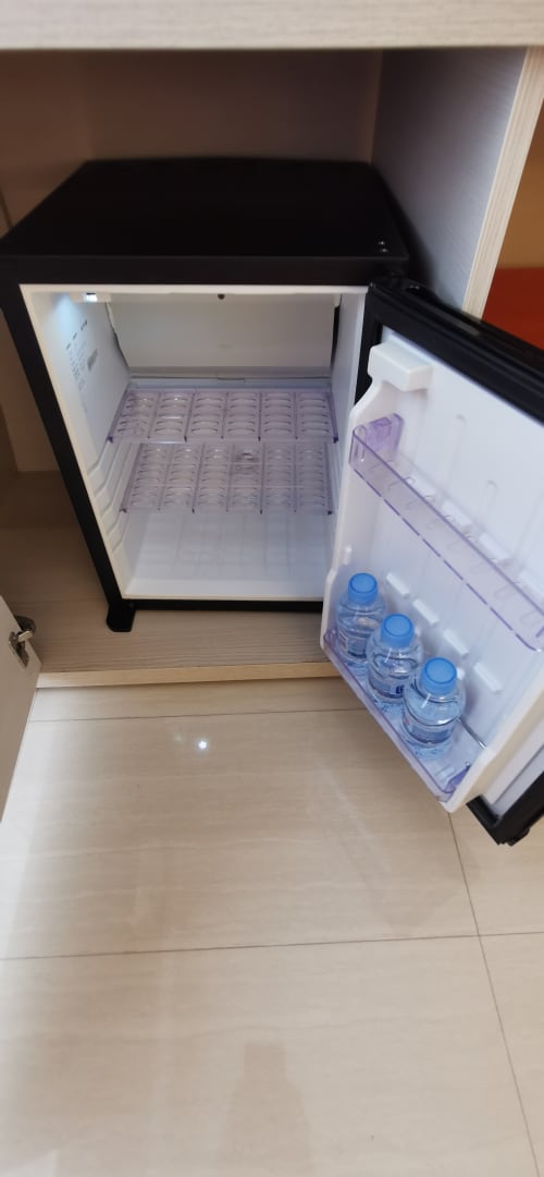 Kleiner Kühlschrank mit drei Wasserflaschen wird nie aufgefüllt