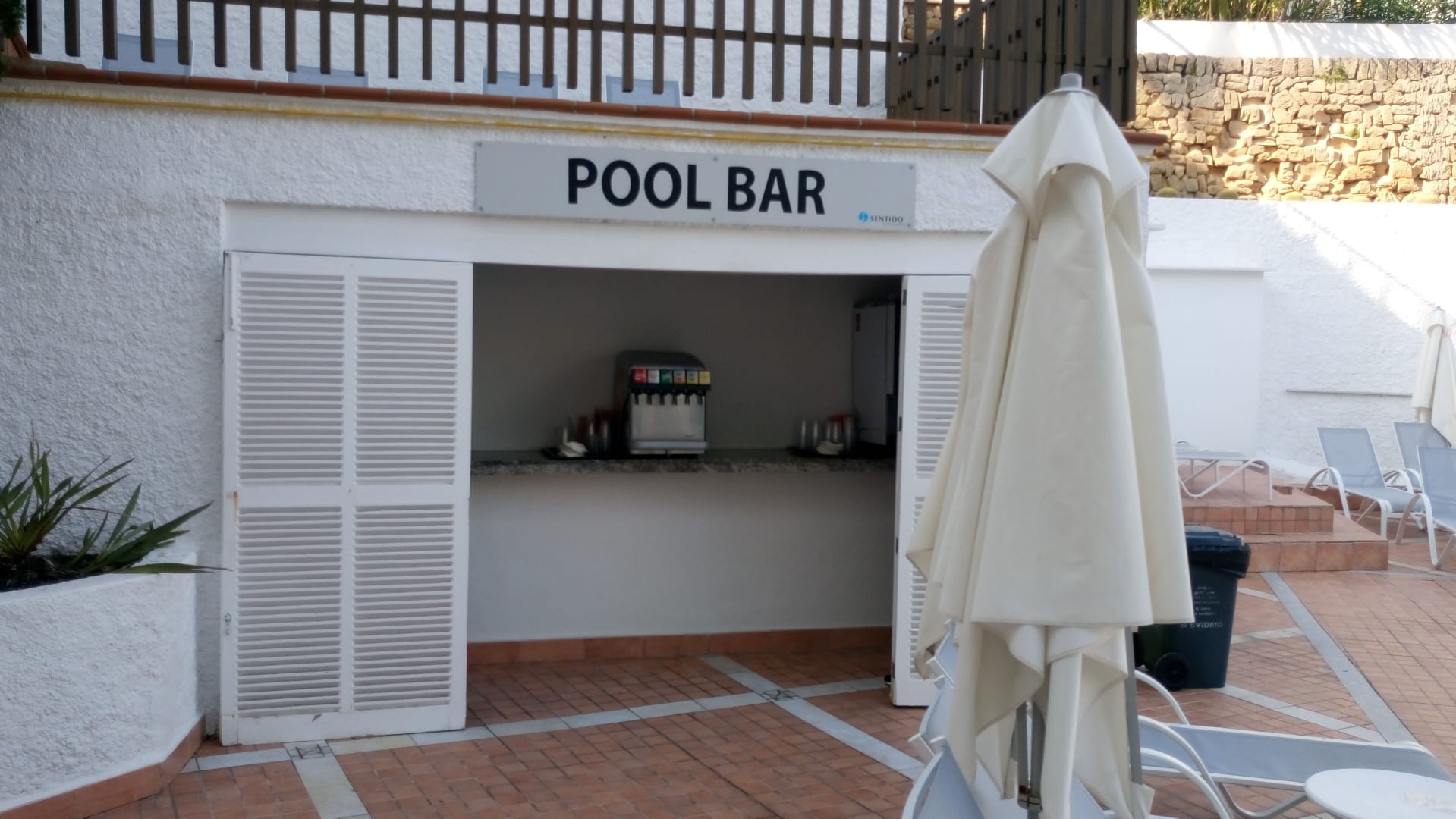 Am Pool ist Selbsbedienung mit Einweg Kunstoffbecher.