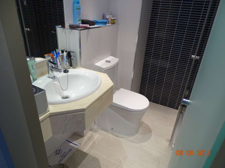 Die Tür der Dusche kann man nur zur hälfte öffnen, das sie so eingebaut ist, dass sie von der Toilettenschüssel gestoppt wird. Im gesamten Bad gibt es nur zwei Haken für die Hand- und Badetücher.