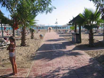 Gloria Golf ResortDer Weg zum Strand, im Hintergrund der Strandpavillon,links und rechts die Strandliegen