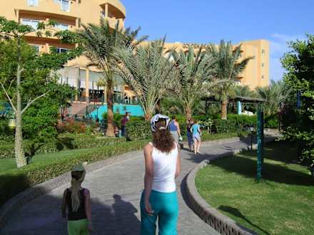 Der Weg durchzieht die ganze Hotelgartenanlage kreisförmig. Am einen Ende ist das Hauptgebäude, am anderen Ende der Strand.
