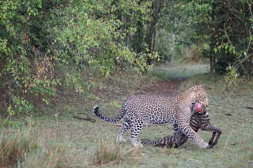 Leopard mit Beute, neben dem Landrover
