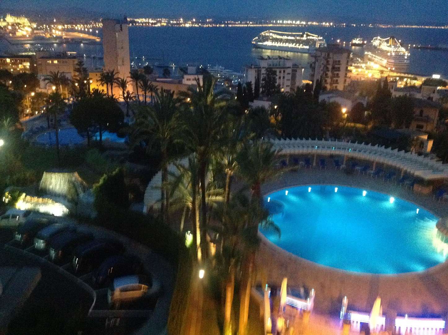 Blick vom ZimmerbalkonAussicht auf dieobere Poolanlage und auf Palma mit der Kathedrale und die Bucht mit dem Landeanlegeplatz der Kreuzfahrtschiffe