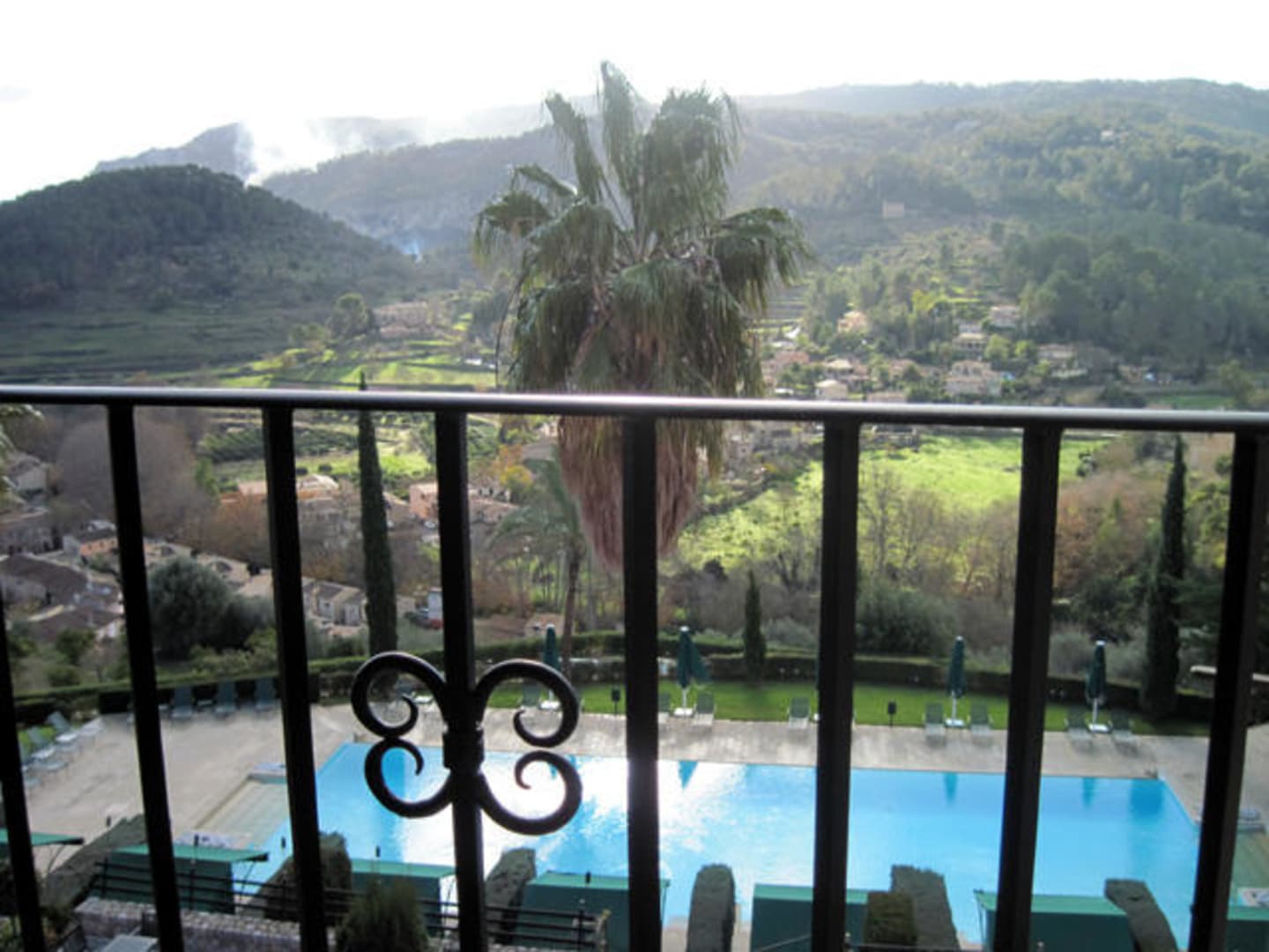 Blick auf den Pool und den Ort Puigpunyent.
