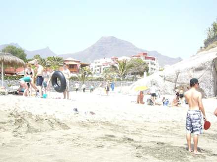 Blick vom Strand - Hotelim Hintergrund rechts ist das Hotel (rot-weiße Gebäude) zu erkennen. Mit den Füßen stehe ich im Meer.