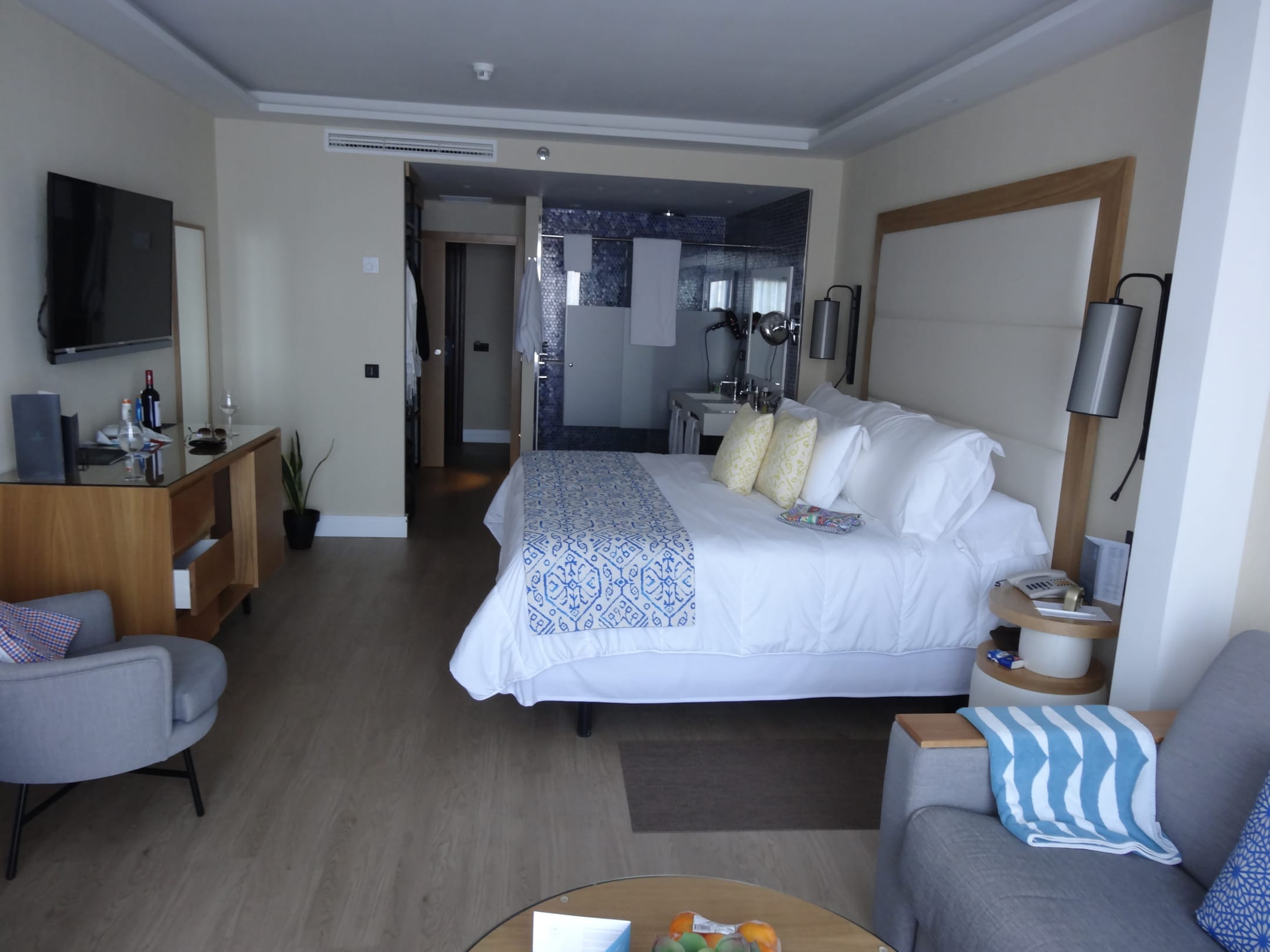 ZimmerUnser Zimmer mit Boxspringbett dahinter die Waschbecken und die Dusche mit diversen Wasserdüsen und Regendusche