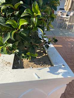 GartenanlageNur Topfpflanzen im Außenbereich, alte Lebensmittel zwischen dem Grün, weil Gäste streunende Katzen füttern.