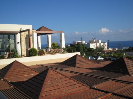 Terrasse der LobbybarLinks hinten eine der Terrassen der Lobbybar. Hinter den Glasfronten innen befindet sich ein großzügiger und geschmackvoller Aufenthaltsbereich mit Couchgarnituren. Die vorherrschenden Farben - Creme, Sand, Terracotta - finden sich in der gesamten Anlage wieder und ergeben ein wunderbar harmonisches Gesamtbild. Unter den kleinen Dächern im Vordergrund befindet sich die Aussenterrasse des Restaurants.